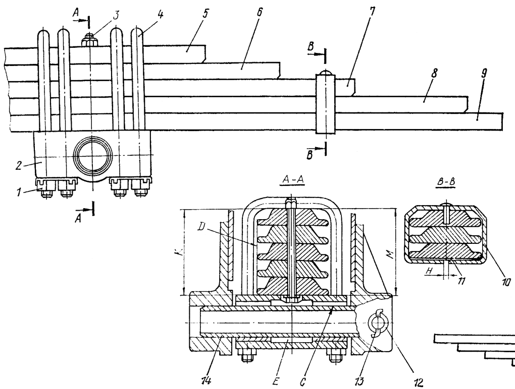 Сожмите рессору, усилием 150 кН (15000-кгс). Снимите нагрузку. Затяните гайки стремянок и застопорите, отогните лапки стопорных шайб на грани головок гаек. Момент затяжки гаек 310...410 Н-м (31...41 кгс-м). Подтяните гайку на болте и раскерните резьбу на болте в трех точках по окружности в местах выхода болта из гайки. Замерьте толщину пяти листов рессоры. Разность размеров К и М не должна быть более 2,5 мм.