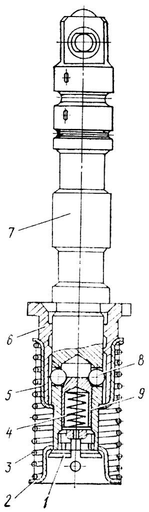 Сожмите нижним стаканом 2 ( рис. 327 ) пружину 3 и отверните пробку 1 золотника. Усилие пружины 250 Н (25 кгс). Снимите нижний стакан 2, пружину 3, верхний стакан 5, обойму фиксатора 6, шарики 8, пружину 4, втулку фиксатора 9. Разборка двух других золотников аналогична.