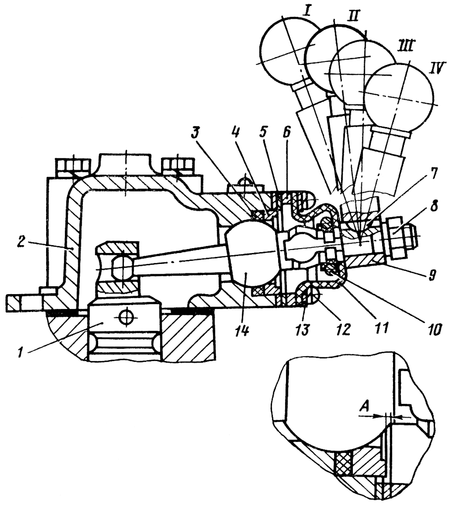 Наденьте на стакан пружину 3 и сожмите ее нижним стаканом 2, заверните пробку 1. Соберите аналогично остальные два золотника. Скомплектуйте золотники по наружному диаметру одноименной размерной группы с отверстием в корпусе. Зазор в сопряжении золотник — корпус должен быть 0,01...0,02 мм. Допускается совместная притирка корпуса и золотника по диаметру с обеспечением зазора 0,01...0,02 мм. Установите скомплектованные золотники в корпус распределителя так, чтобы штифты корпуса вошли в паз обойм фиксаторов, а верхние радиальные отверстия золотников были направлены в сторону перепускного клапана. Смажьте лаком «Герметик» .прокладку 13 ( см. рис. 326 ), установите и закрепите болтами нижнюю крышку 1. Момент затяжки болтов крепления крышки 30...50 Н-м (3...5 кгс-м). Смажьте лаком «Герметик» прокладку 6, установите и закрепите верхнюю крышку 9. Момент затяжки болтов крепления верхней крышки 15...35 Н-м (1,5...3,5 кгс-м). Смажьте лаком «Герметик» прокладку 8, установите болтами крышку 7. Момент затяжки болтов крепления крышки 15...35 Н-м (1,5...3,5 кгс-м). Заверните пробку 4 с уплотнительным кольцом 5. Установите рычаг 10 малой шаровой поверхностью в отверстие хвостовика золотника 2. Наденьте уплотнительное кольцо 3 ( см. рис. 325 ) и кольцо 4 на сферическую поверхность рычага. Отрегулируйте прокладками 5 зазор А, равный 0,0...0,3 мм между торцом кольца 4 и торцом фланца 6. Наденьте пружинное кольцо 10 на чехол И и установите чехол в кольцевую проточку рычага 14. Установите на чехол шайбу 13 и закрепите к фланцу 6 и крышке 2 винтами 12 с пружинными шайбами. Установите аналогично два других рычага. Установите в пазы рычагов 14 сегментные шпонки 7 и наденьте рычаги 9, закрепите их гайками с пружинными шайбами.